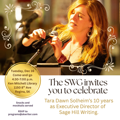 The SWG invites you to celebrate Tara Dawn Solheim’s 10 years as Executive Director of Sage Hill Writing! Please join us on Tuesday, December 16 for our come-and-go party between 4:30 – 7:00 pm at the SWG Office's Ken Mitchell Library - #1150 8th Avenue, Regina.