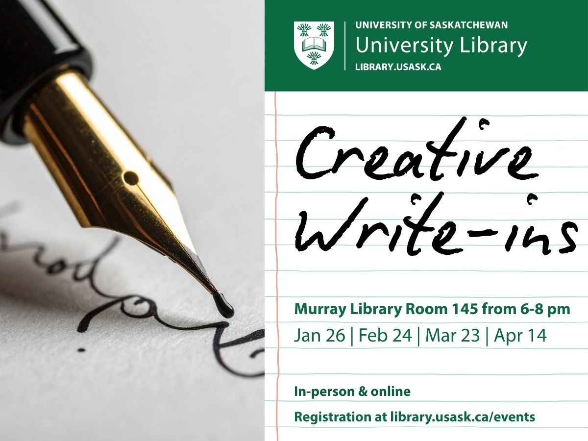 Creative write-in is back this winter! Join other creative writers at USask’s Murray Library to work on your creative writing project. We’ll be hosting a write-in monthly on from 6-8 pm. You can attend online or in-person (Murray Library Room 145). All you need to bring are your writing tools (laptop, notebook, pens) and your creative ideas! Writing prompts will be provided for those who need a starting point or are stuck in their current project. Each event will have free writing time with breaks to chat and connect with other writers. Refreshments will be provided. These write-in events are open to everyone.