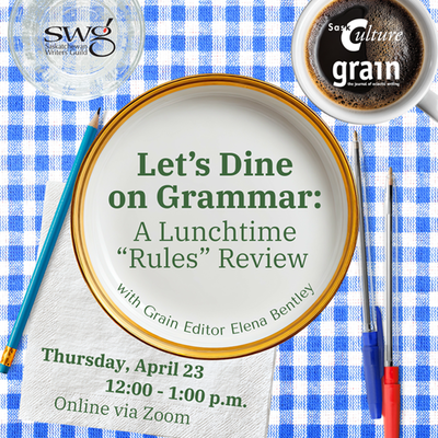 Spend your noon hour with Grain’s editor, Elena Bentley, a self-confessed grammar nerd! Bring your lunch and grammar questions to the SWG’s virtual classroom, where we’ll take a bite out of common writing errors and chew on the “rules”—when to follow them and when to break them.