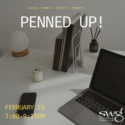 How Penned Up! works: registration via Zoom will be set up, then we will email the link and folks can drop in and out as they’d like during the two-hour period. After the first 45 minutes of undisturbed writing time, the SWG will offer participants the option to go into a breakout room to have a break and talk to other participants. This break is not mandatory! If you’re in a groove, keep going! You’re also welcome to take breaks as you need them at any point during the two hours.