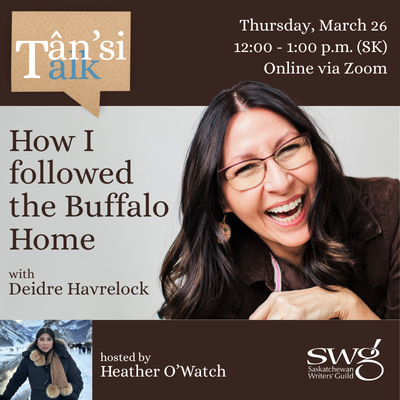 The SWG and host Heather O’Watch invite you to help us in welcoming Deidre Havrelock! Travel with Deidre through her writer’s journey. From passion to failure to confusion, a disenchanted and very much lost Deidre eventually follows the Buffalo home to her first published children’s book titled ‘Buffalo Wild!”